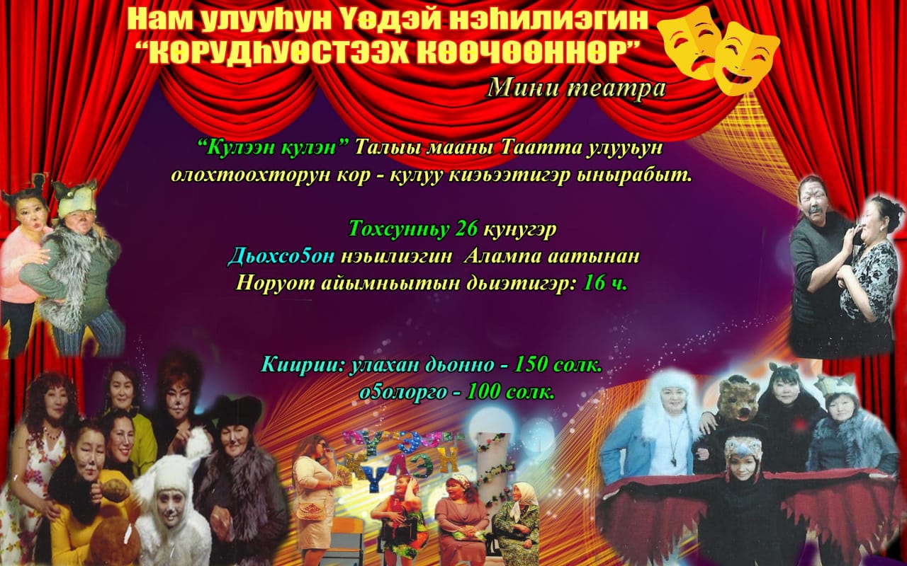Бүгүн Тохсунньу ый 26 күнүгэр Таатта улууһун Нам Үөдэй нэһилиэгин көр - күлүү бөлөҕө аам дьаам тымныы диэбэккэ гастроллуу сылдьаллар. Халлааммыт бүгүн биһиэхэ 52 кыраадыс буолла, таһырдьа тымныы да тымныы, залга толору да буолбатарбыт көрү нары сэҥээрээччилэр сүрдээҕин кэлэн көрөн поддержкалаан бардылар. Үөдэй нэһилиэгэр махтал дэлби күлээн, күлэн тыыммыт таҕыста.