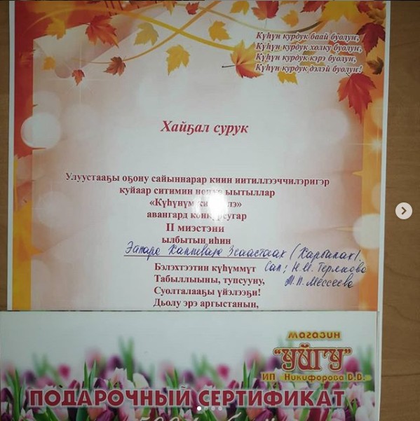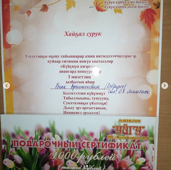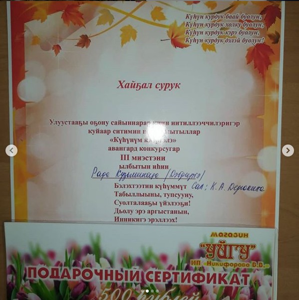 1️⃣ миэстэ МБДОУ "Теремок" улахан бөлөх оҕото Дэбдиргэттэн *Вика Афанасьева* Салай- чы: Дария Константиновна Лопатина.